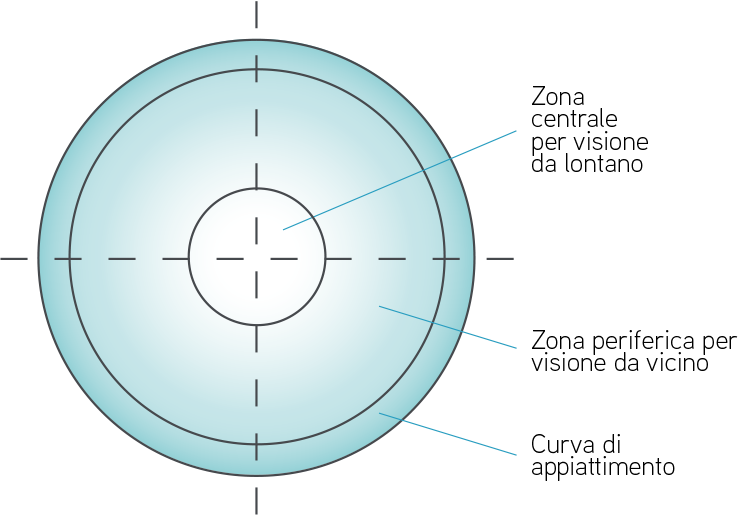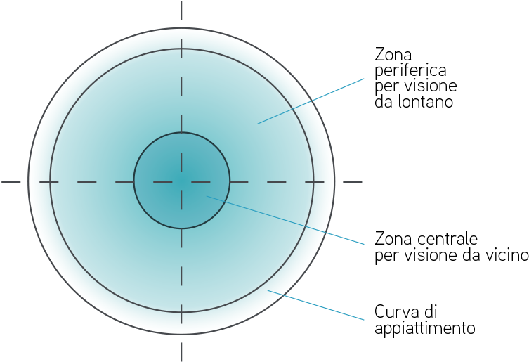 è costruita in una gamma di addizioni standard. Con zona centrale per la correzione per lontano e zona periferica per vicino oppure zona
