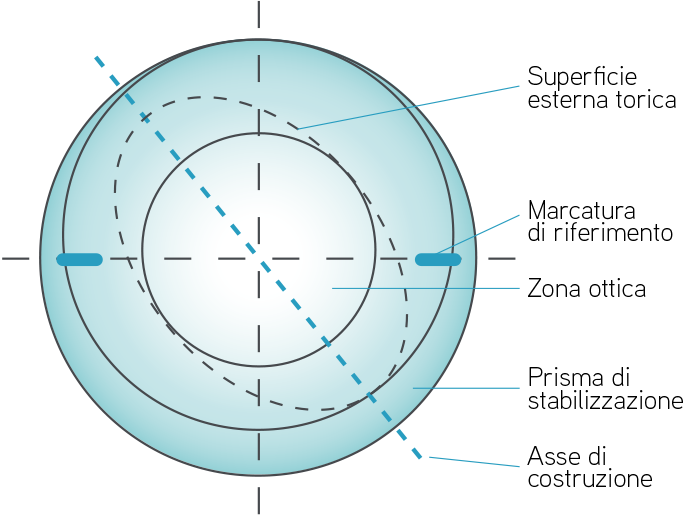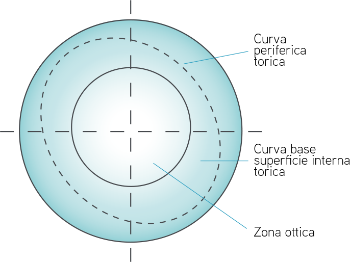 È la lente a contatto ideale per la correzione dell’astigmatismo residuo,nel caso in cui non si riesca un ottimo visus con la lente a contatto sfero-asferica o una con superficie interna torica. La geometria interna, che può variare a secondo delle esigenze applicative ed essere sfero-asferica oppure sferica tricurva, si combina con una superficie esterna torica prismatica, stabilizzata con il sistema di Ballast prismatica o dinamica.
